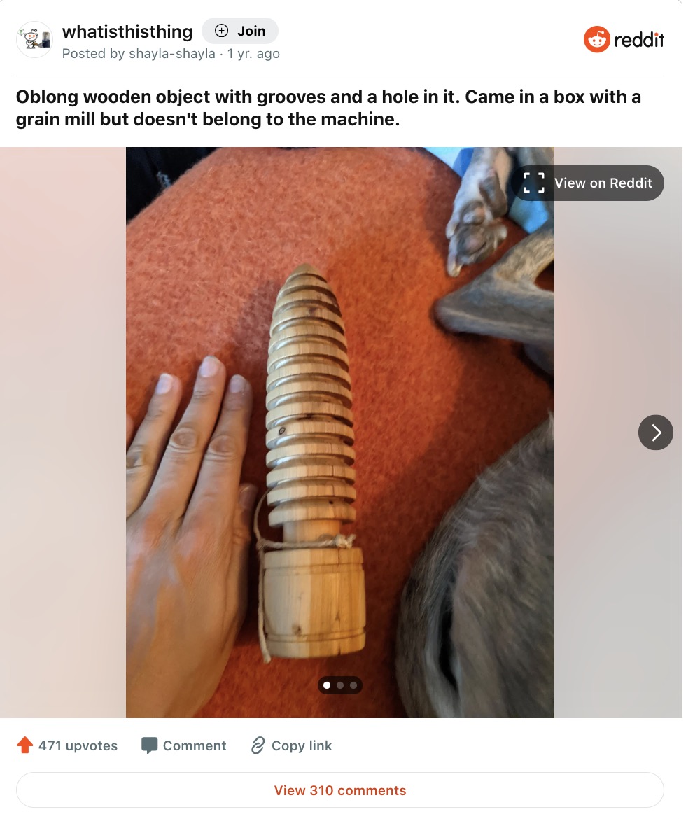 Amidst a collection of items, a woman discovered a large wooden object with grooves and a hole. Initially mistaken for a part of a grain mill, the Reddit community identified it as a wooden Christmas tree crafted by someone practicing woodturning.