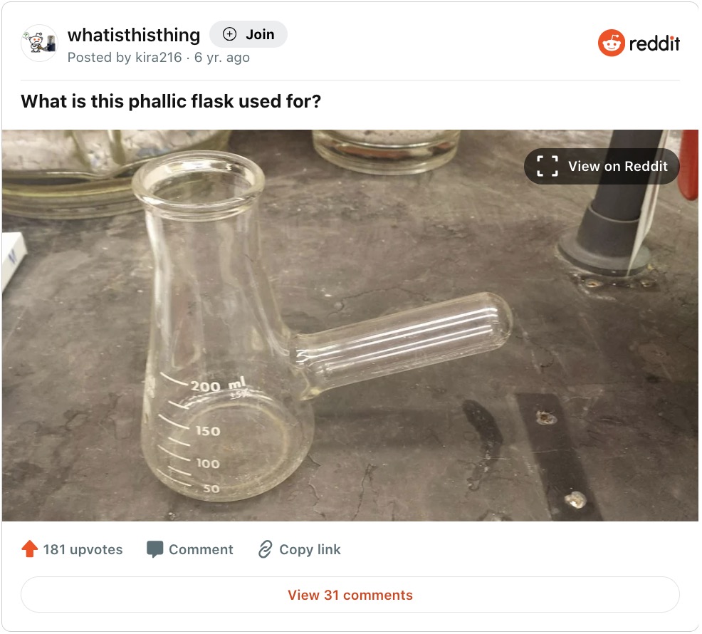 A person found themselves in possession of a phallic laboratory flask, complete with measurements and a distinctive long part resembling a handle. Reddit revealed its purpose – to analyze mixtures without extracting a sample. Confirmation came from a user with a molecular microbiology lab who had several such flasks.