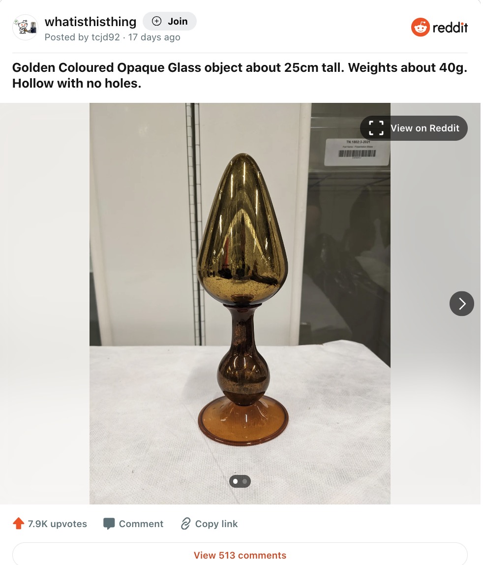 A golden-colored, opaque glass object standing 25cm tall and weighing 40 grams intrigued one Reddit user. The community swiftly identified it as a home decor item, crafted with blown glass, resembling a piece of art.