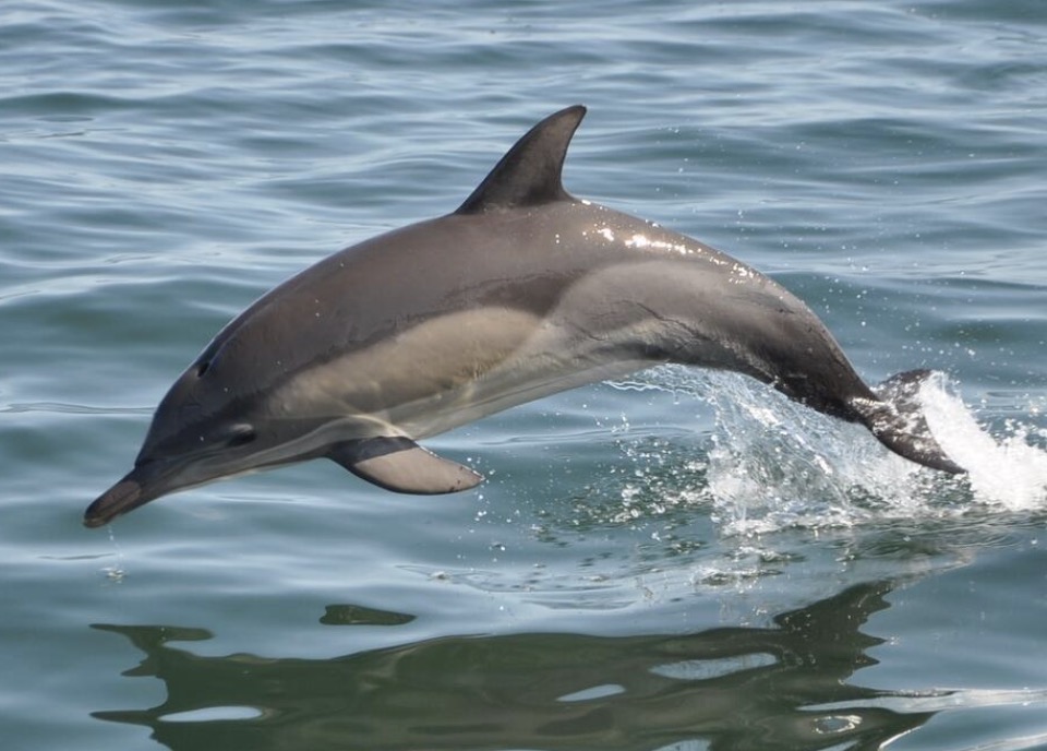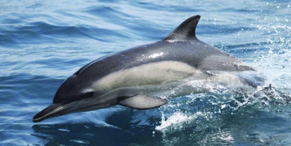 The common dolphin has a bluish-gray to brown color on its dorsal side, with a V-shaped lateral boundary that is very light. A pigmented band, varying in darkness, connects the lower jaw to the insertion of the pectoral fins. The dorsal, pectoral, and caudal fins are black to gray-brown.