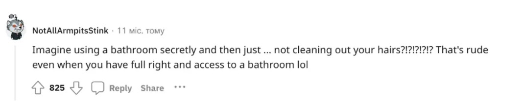 Another Redditor said, “Imagine using a bathroom secretly and then just … not cleaning out your hair?!?!?!?!? That’s rude even when you have full rights and access to a bathroom, lol.”