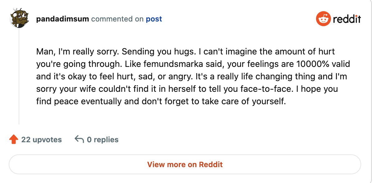 “I am so so incredibly sorry. I have an idea how much this hurts…All your feelings are valid. A lot of people will react with some kind of toxic positivity to things like these. Your feelings are valid,” Redditor femundsmarka wrote. OP thanked the person and said he intended to go on a long drive to get a breath of fresh air and overcome this emotional burden.