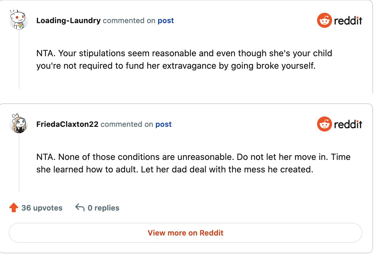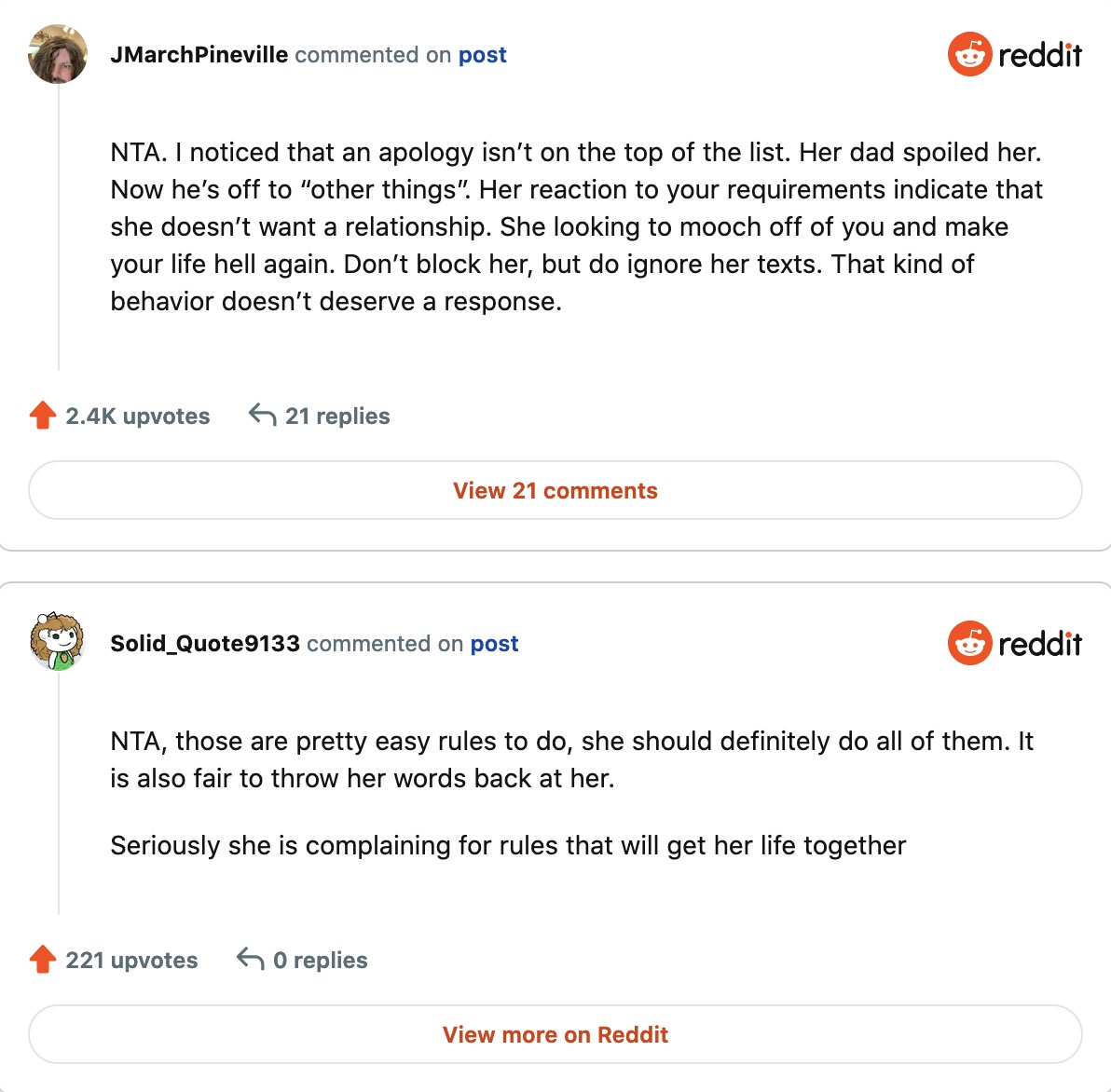 Other Reddit users found the conditions reasonable and primarily for Maria’s benefit in the future. Considering her adult age, she should not have contested her mom’s requests.