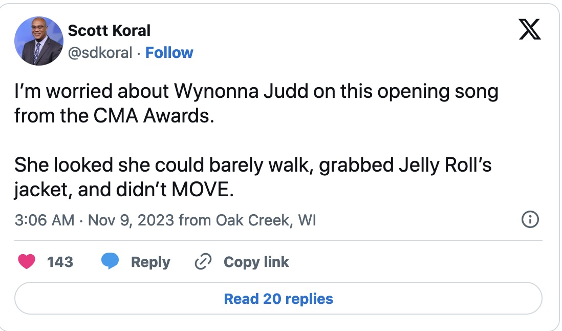 Someone else expressed concern, “I’m worried about Wynonna. […] She looked [like] she could barely walk, grabbed Jelly Roll’s jacket, and didn’t MOVE.”