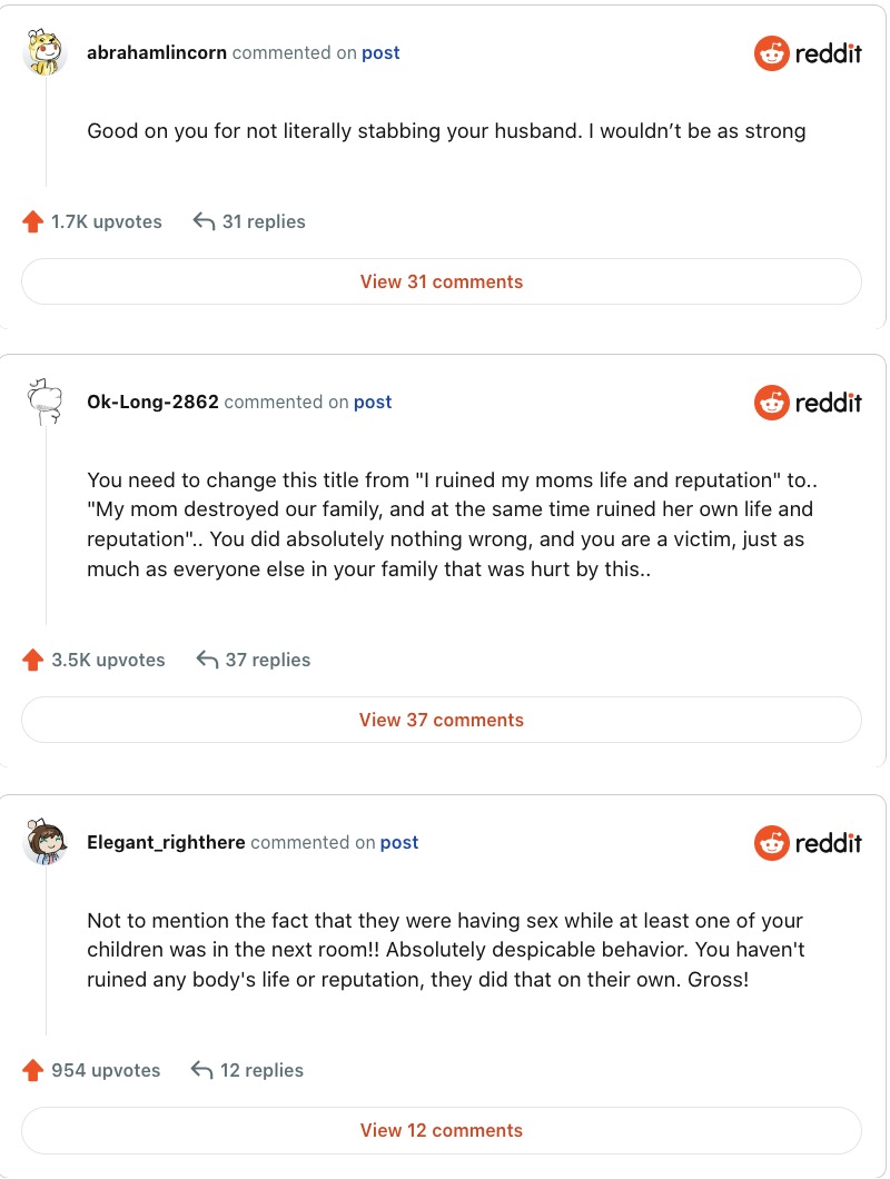 “I walked into my bedroom to find my mom having sex with my husband. My mother screamed at me to get out of ‘their’ bedroom, which really shook me up even more.”