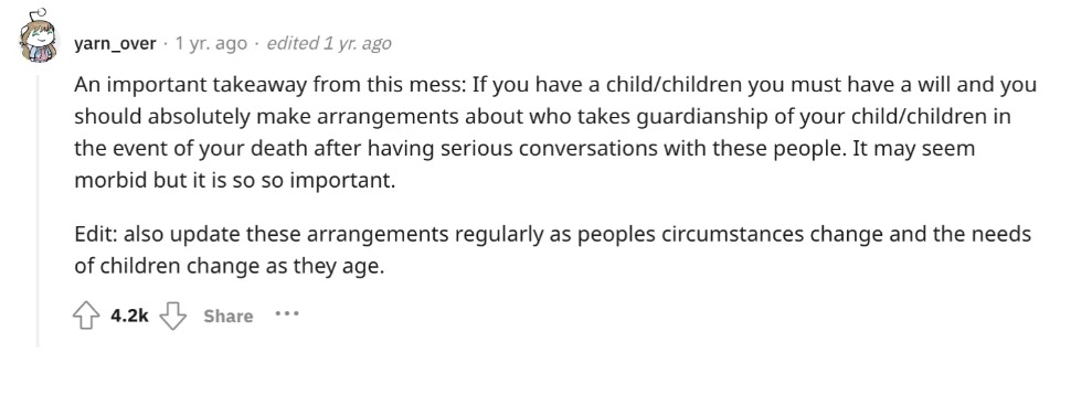 One person added a valuable piece of advice, saying that if the OP had children or anyone reading had children, they should have a will saying who would take guardianship of their children when they died.