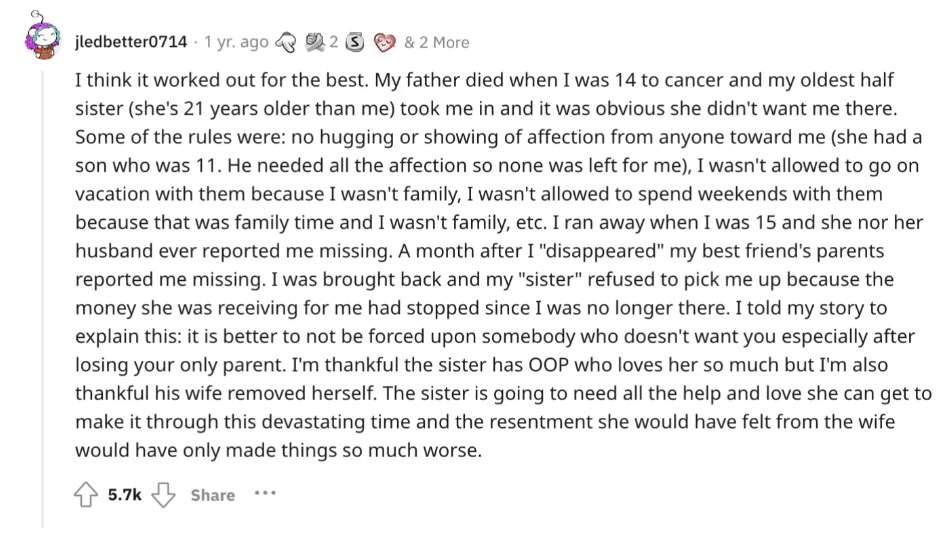 Another person shared their experience, saying after their parents had died, their half-sister took them in, and it was apparent they weren’t wanted there. The person then ran away when they were 15, and neither their half-sister nor her husband reported it.