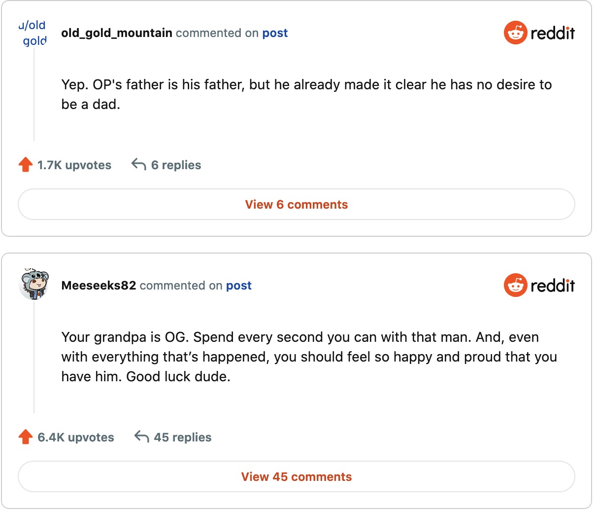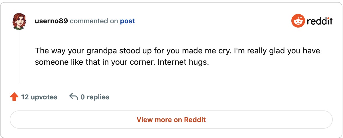 The older man reassured him about family bonds and advised him to remember them when starting his own family. As a side note, OP detailed his troubled relationship with his older brother, highlighting theft, lies, and bullying, with his grandpa stepping in to protect OP from physical harm.