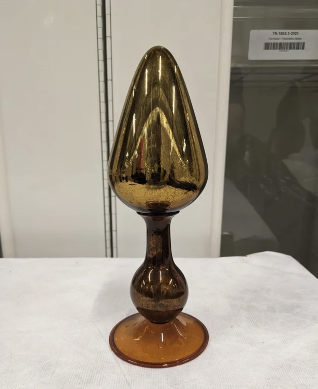 One person found a golden-colored opaque glass object and wondered what it was for. The person who had measured the item noted that it stood 25cm tall and weighed about 40 grams.