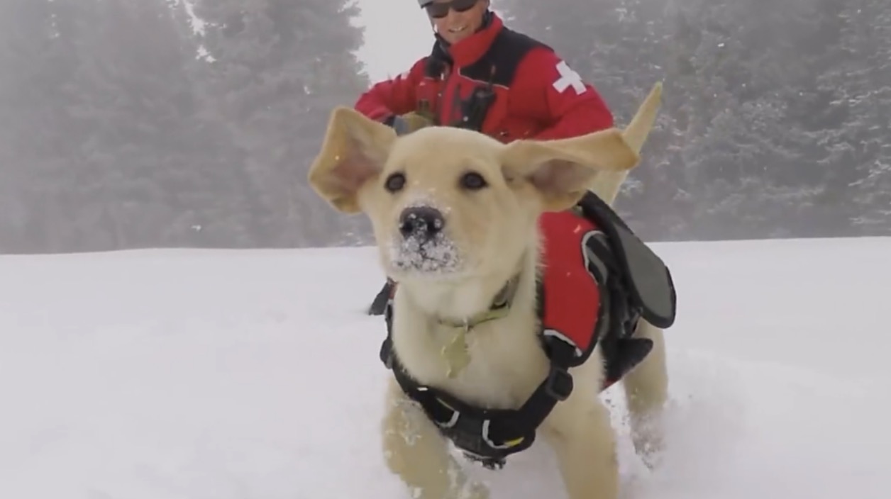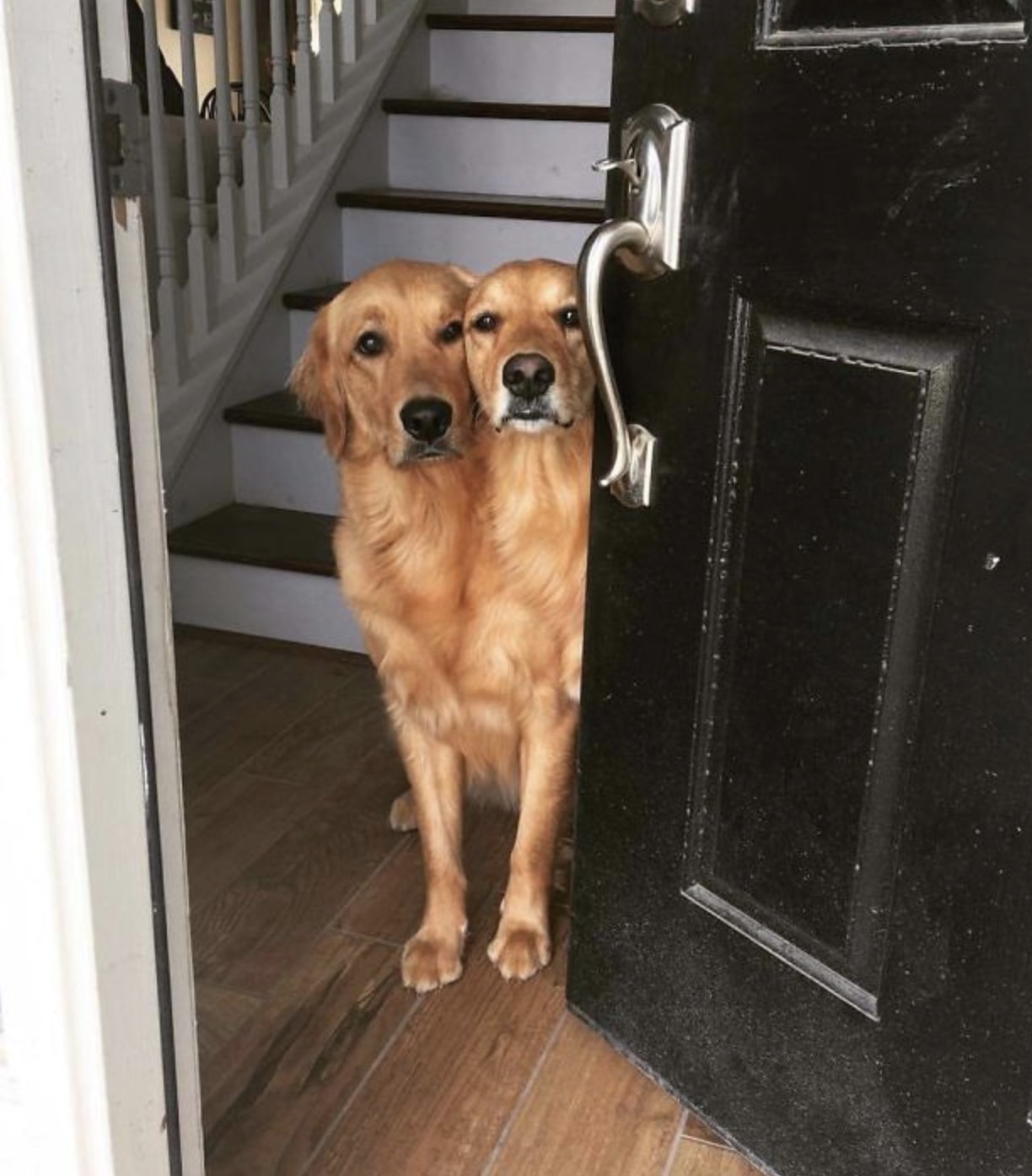 These two retrievers are so eager to greet whoever is at the door they seem to have collided with one body. They look like they have literally combined at the shoulder. Two dogs became one.