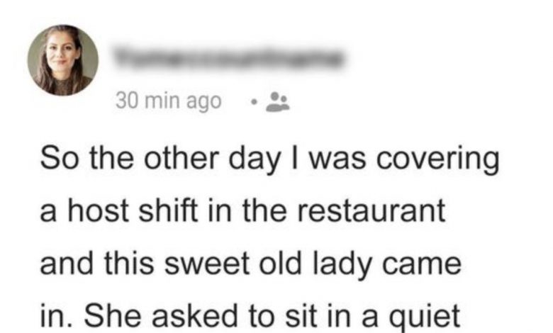 At the restaurant where littleaprilroses worked, he was used to having different people over. But one customer stood out to him. An older woman who looked nice walked in and looked confused while she was filling a host shift.