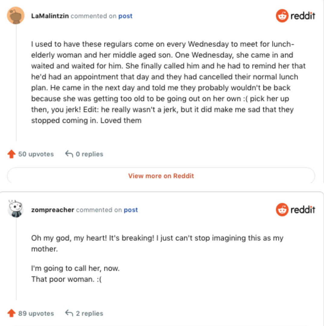 A Reddit user named zompreacher wrote: “Oh my god, my heart! It is cracking! I can’t help but picture this as my mother… “I’m going to call her right now.” The OP said she felt the same way.