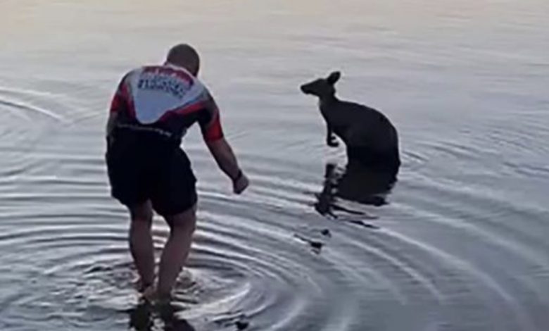 Brave bystander saves kangaroo from freezing lake but has no clue he’s about to get the thank you of a lifetime