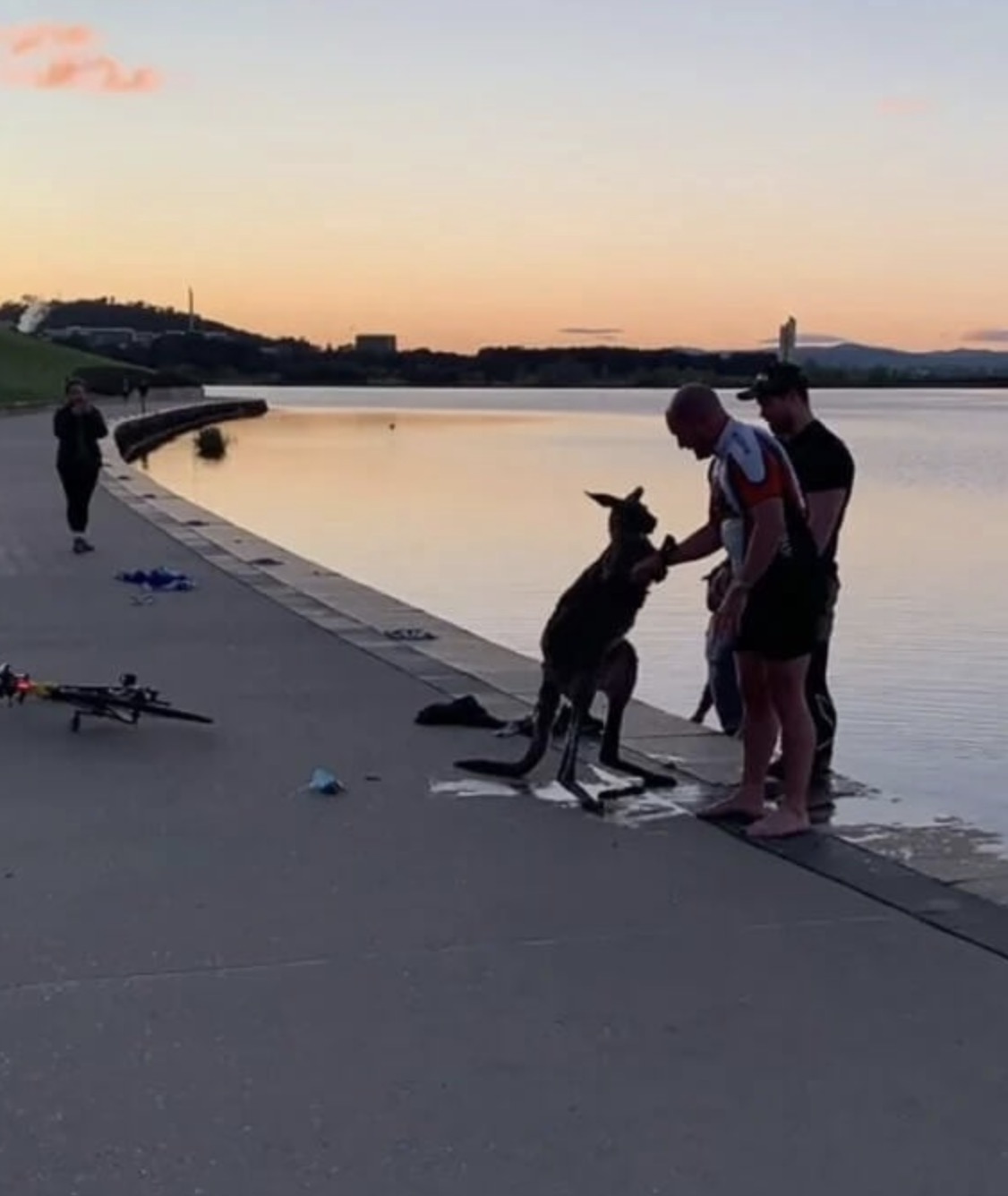 Brave bystander saves kangaroo from freezing lake but has no clue he’s about to get the thank you of a lifetime
