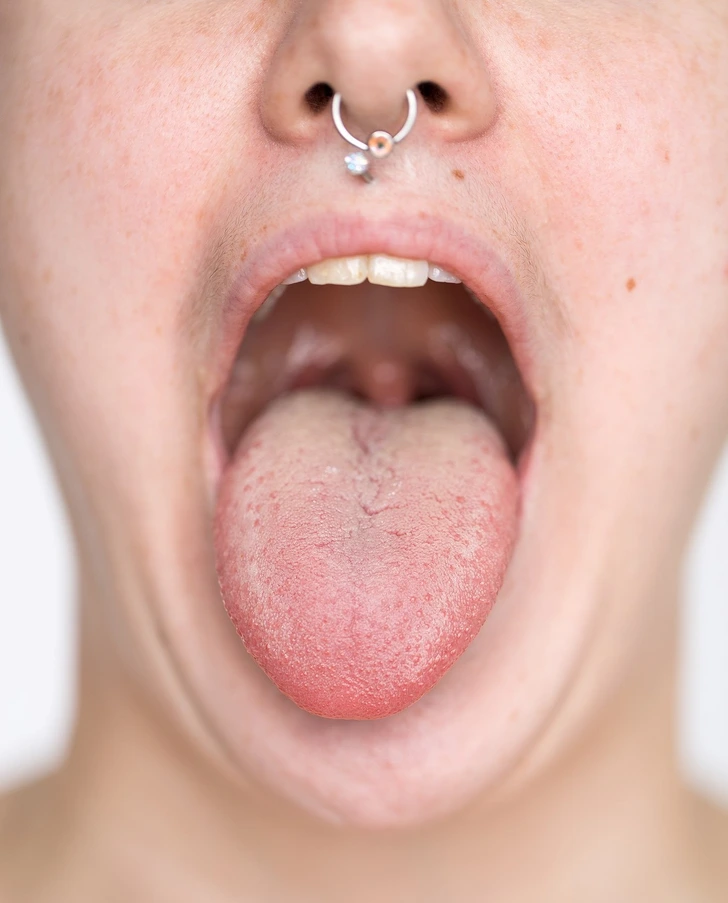 Right after piercing the tongue, there might be some white film present. This happens because the number of bacteria on the tongue increases, and it’s normal. Antibacterial mouthwash will help you get rid of it. Plus, there might be a ring around the piercings, which is normal too, and it means the tissue is healing.
