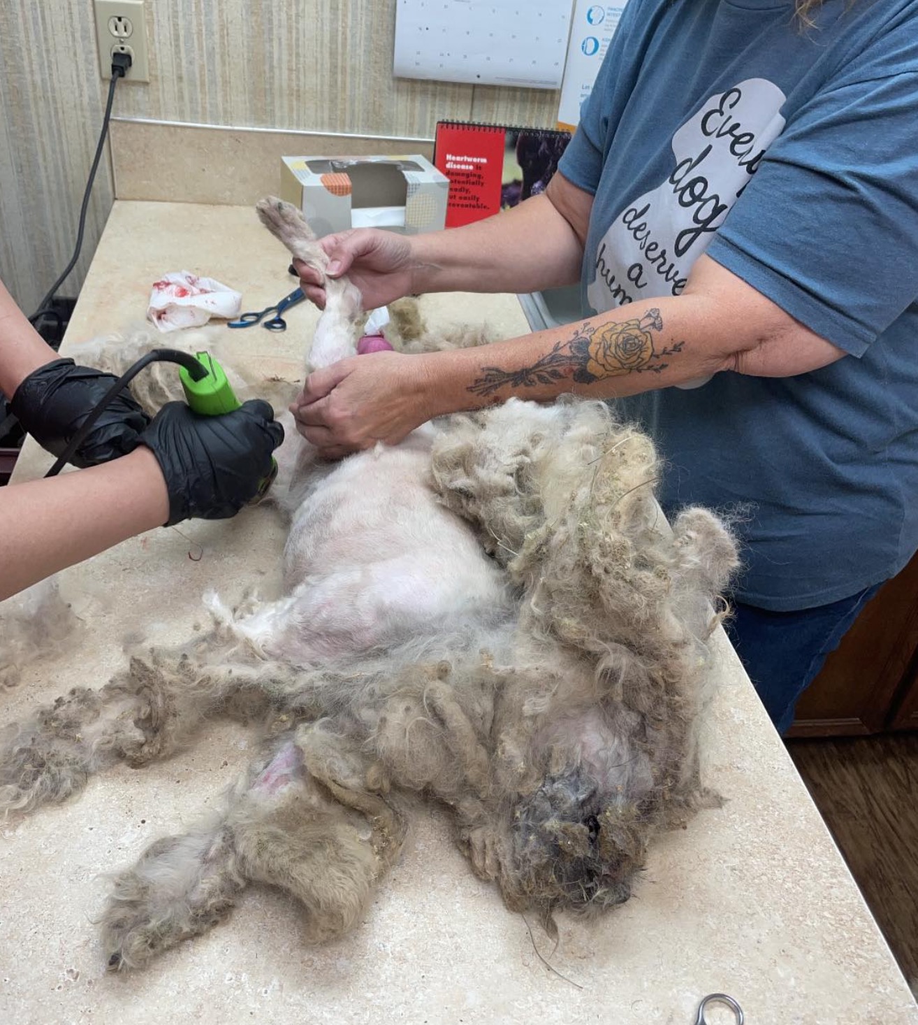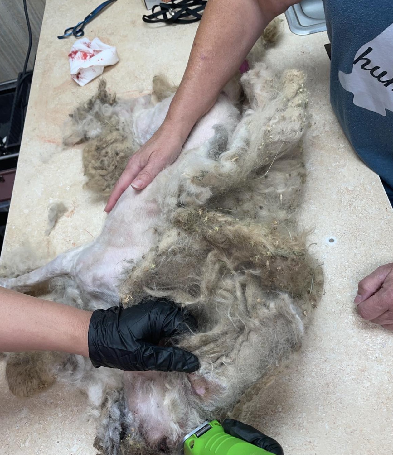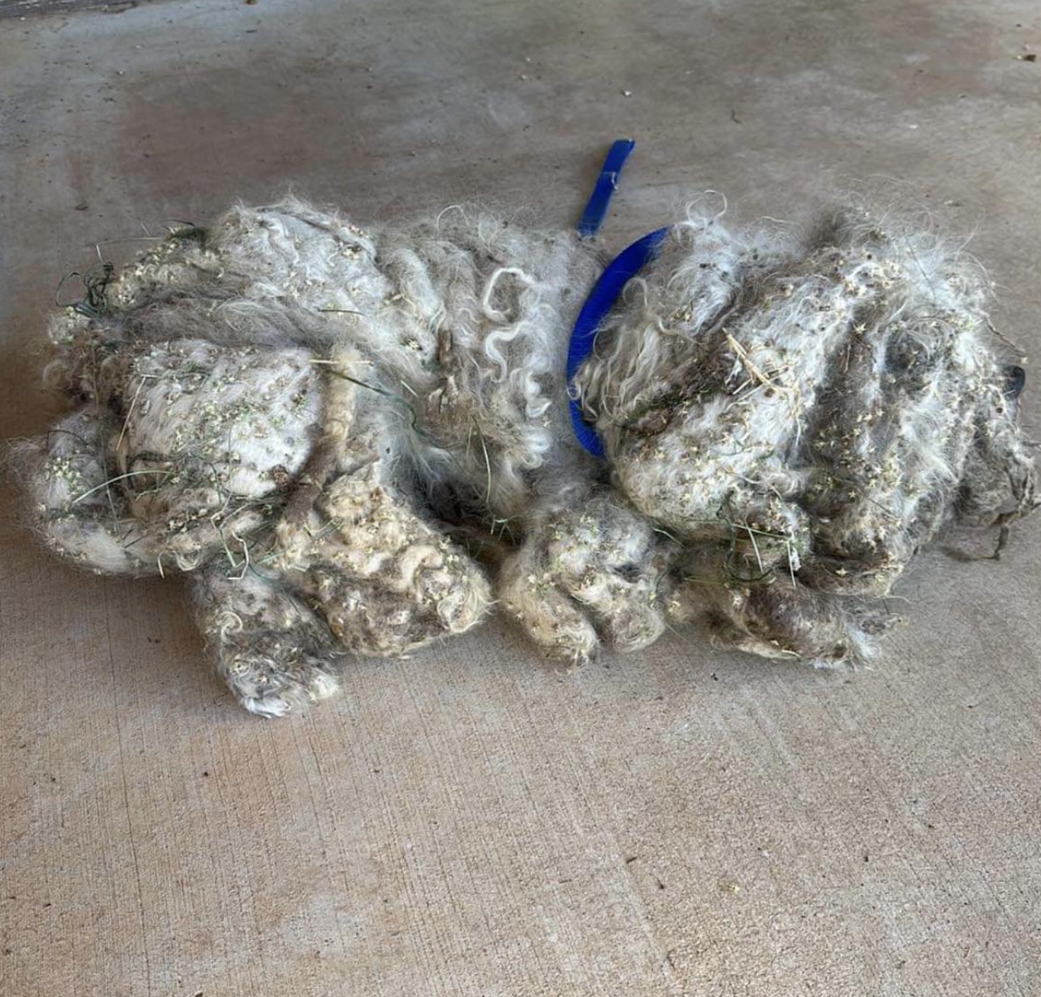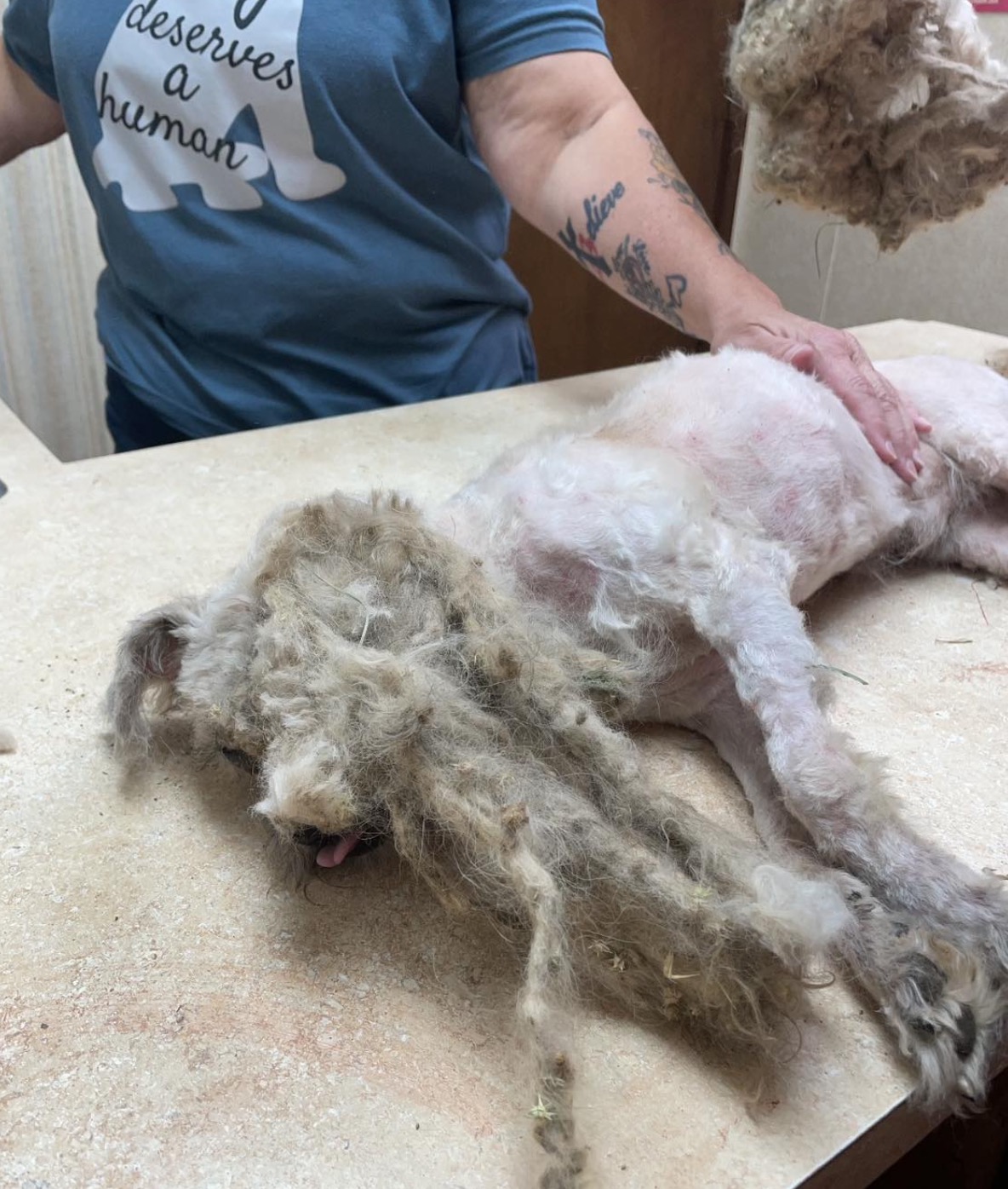 Matt reportedly yelped with pain every time they tried to cut his hair, so they had to sedate him. They cut through a collar and leash that was embedded in the hair, and shaved off a whopping three pounds of fur — the result of five years of neglect.