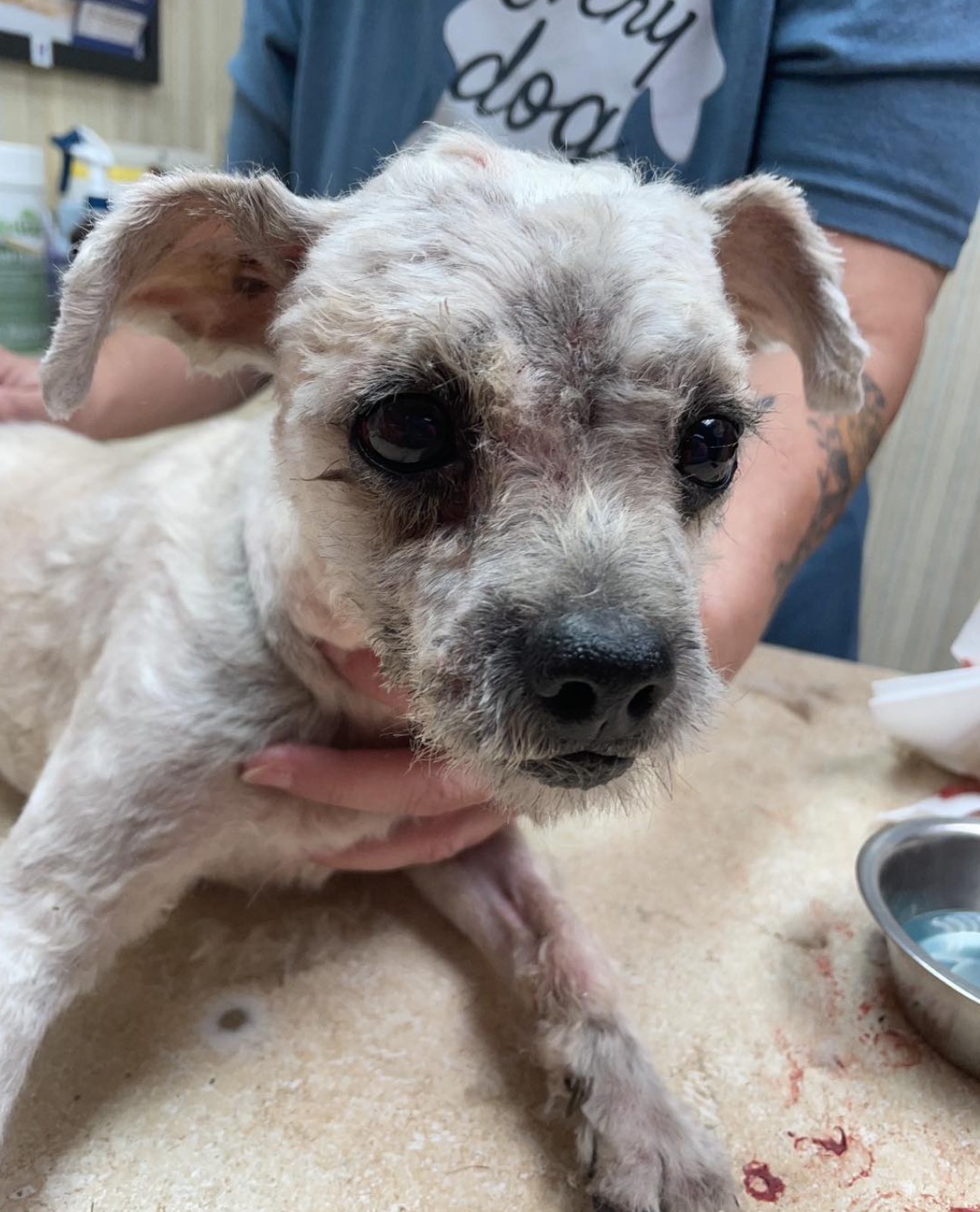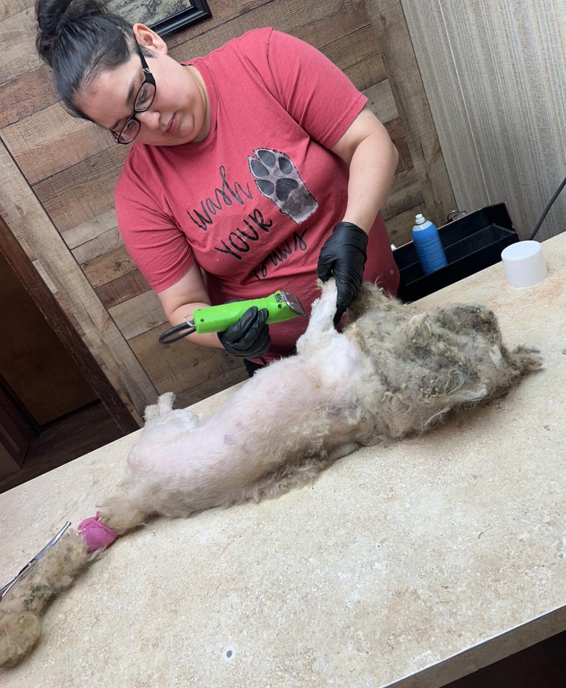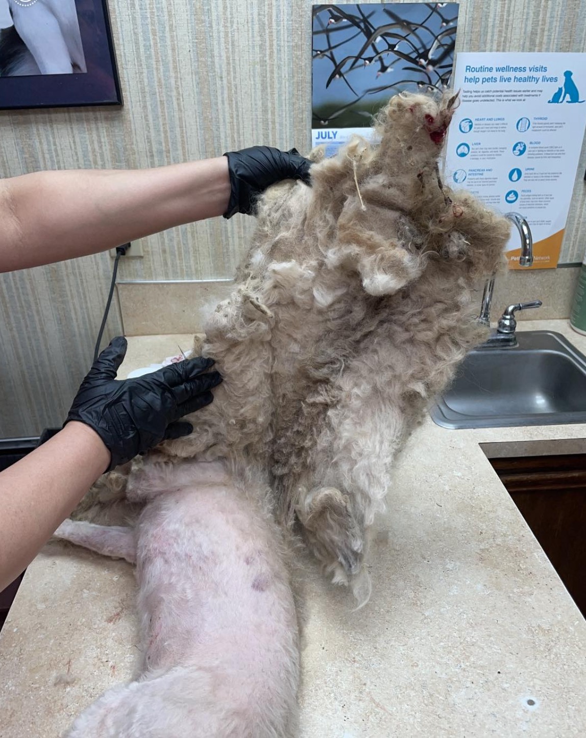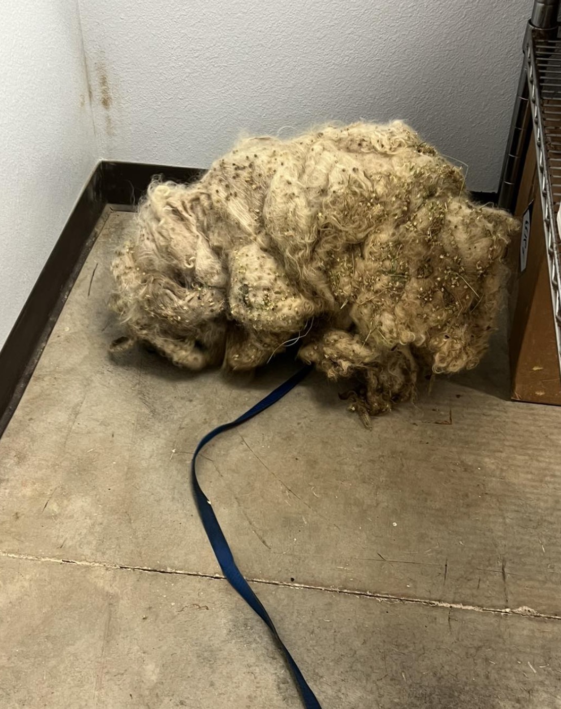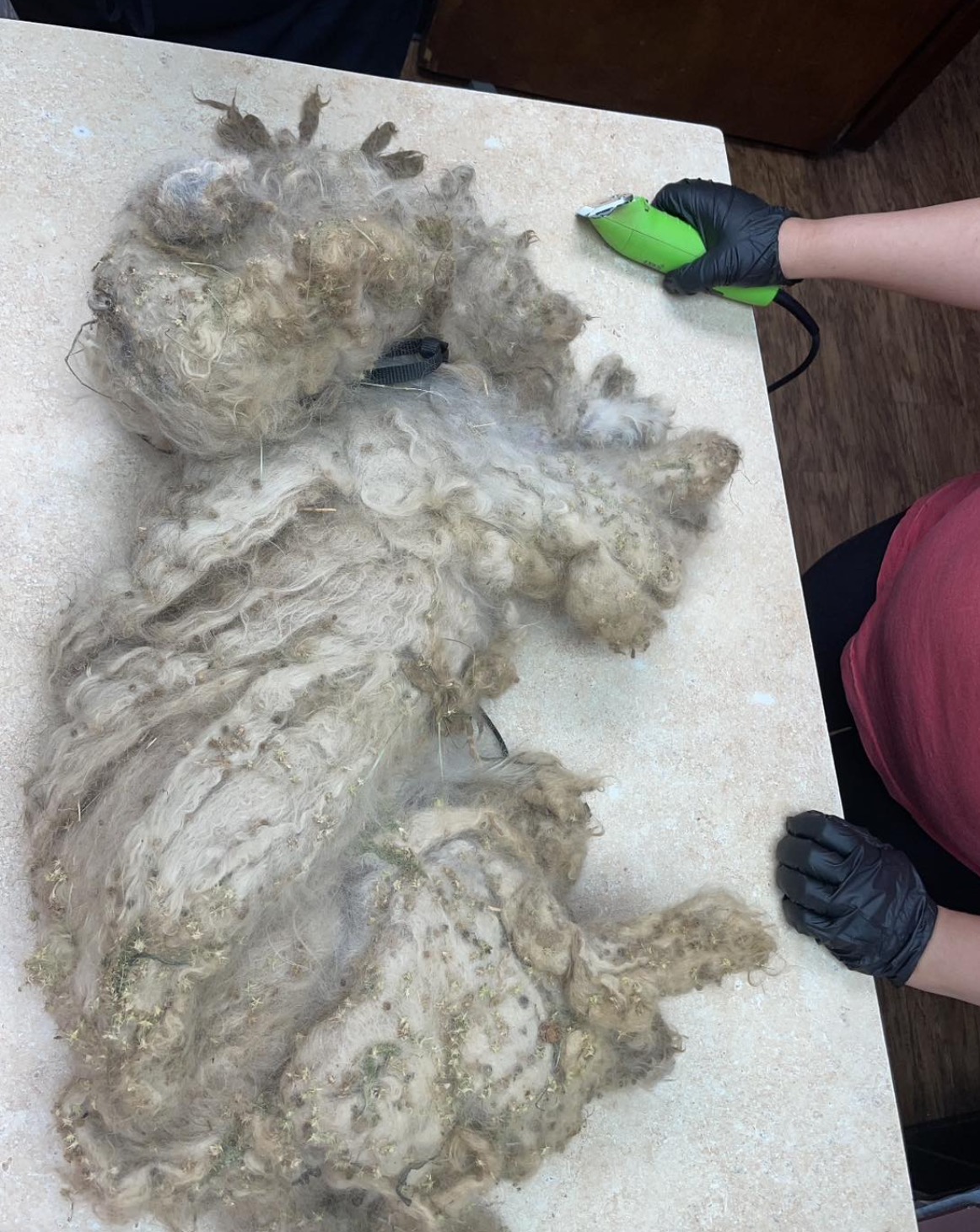 Matt reportedly yelped with pain every time they tried to cut his hair, so they had to sedate him. They cut through a collar and leash that was embedded in the hair, and shaved off a whopping three pounds of fur — the result of five years of neglect.