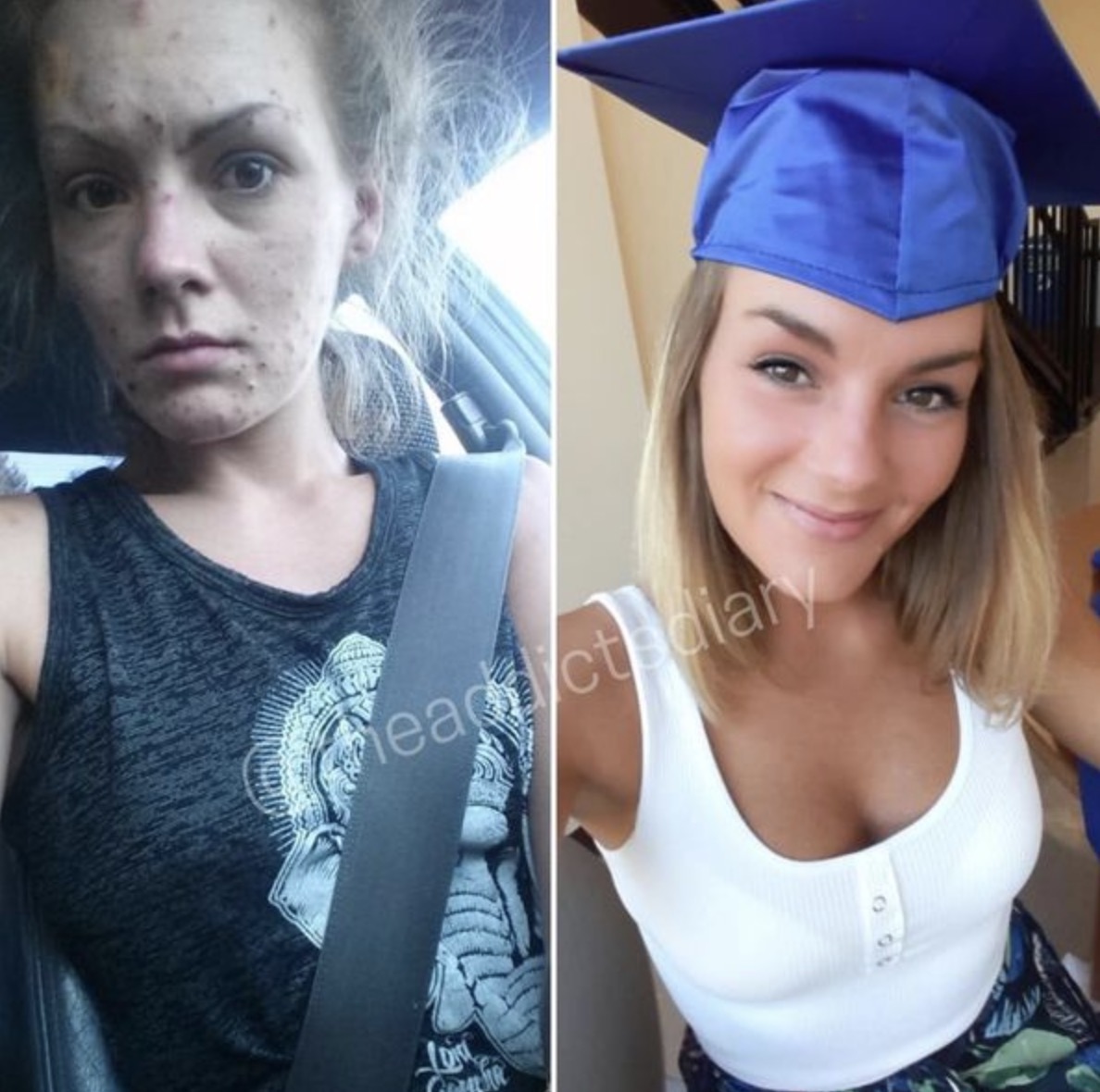 In her post, Jamee explains how she overcame addiction, turning her life around completely. She proudly announces, “My name is Jamee and I am a recovering heroin and meth addict.” She goes on to say, “These pictures are 2 years apart. The better looking version of me being just a few months ago when I got my GED! Recovery is possible!”