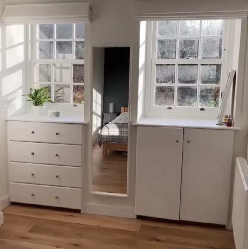 He also used the space under the room’s windows for his little closet and some cabinets.