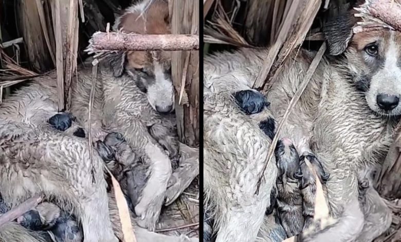 Alone In Her Efforts, A Mother Dog Fiercely Battles To Ensure The Survival Of Her Babies, Her Determination Evident As She Faces Immense Challenges Without Aid From Anyone