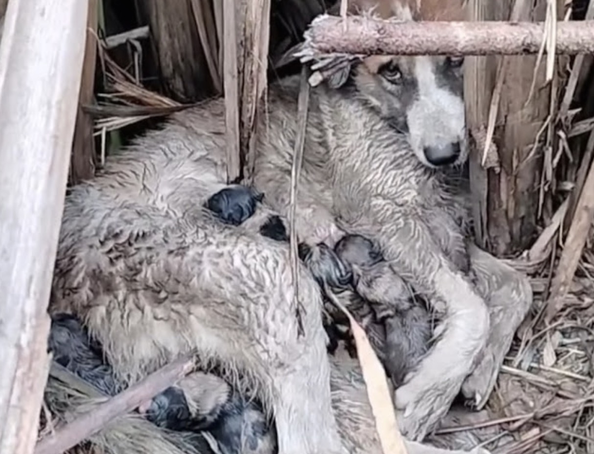 Alone In Her Efforts, A Mother Dog Fiercely Battles To Ensure The Survival Of Her Babies, Her Determination Evident As She Faces Immense Challenges Without Aid From Anyone