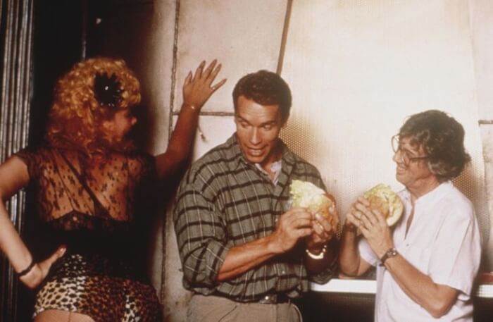 #10 Arnold Schwarzenegger observing his coworker during filming Total Recall