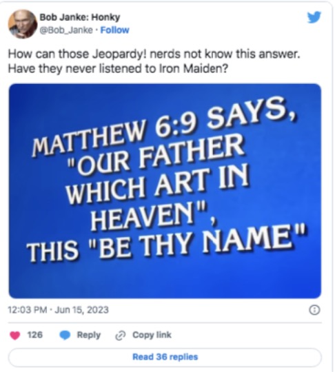 “How can those Jeopardy! nerds not know this answer. Have they never listened to Iron Maiden?” another user joked, referencing the Iron Maiden song “Hallowed Be Thy Name.”