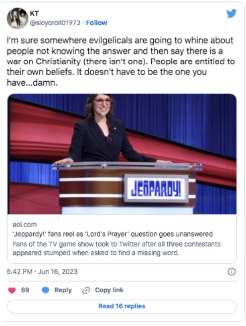 “My 4 year old niece got the answer on this Question on Jeopardy! Just wondering maybe the contestants never heard about The Lord’s Prayer?” another wrote.