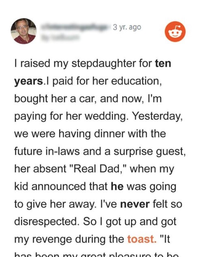On June 2, 2013, an anonymous man turned to Reddit’s “Off My Chest” forum to share a story that had weighed heavily on his mind as his stepdaughter’s wedding day approached. He expressed his feelings with a sense of frustration and disappointment.