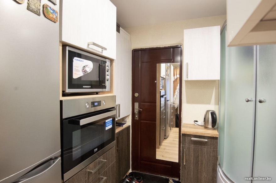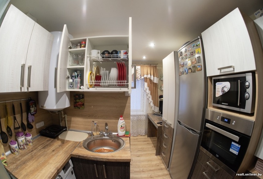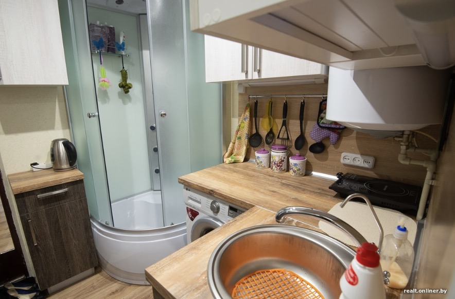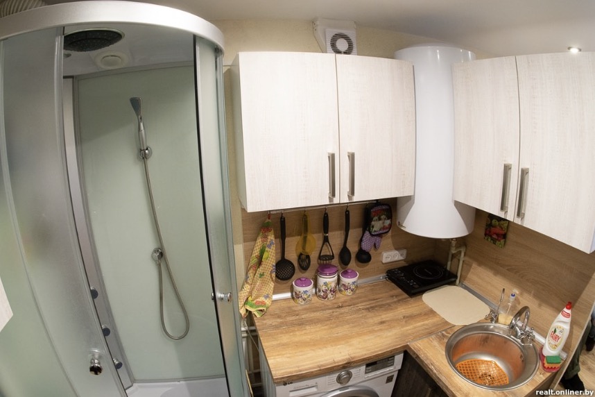 However surprising it may seem, he could also install the bath cabin in the kitchen. He installed a boiler as well and always had hot water. Nikolay got a washing machine, an oven and all the needed things.