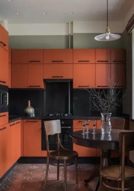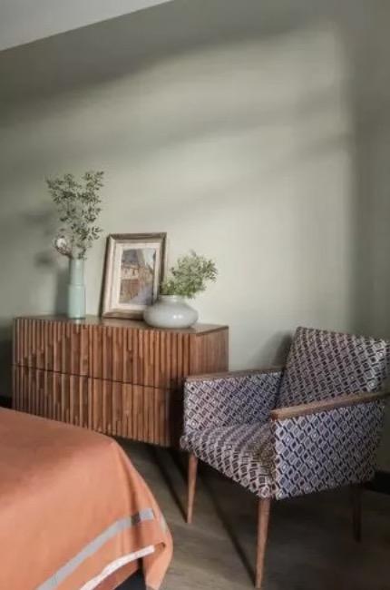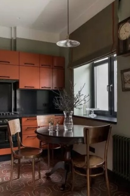 The house is painted in white, gray and deep green colors. The furniture in the kitchen has orange elements. This vibrant color became the final touch to the monotonous shades of the walls and furniture.