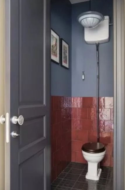 The toilet and bathroom are in gray and red walls. There is also a shelf in the bathroom where one can store towels, underwear and other accessories.