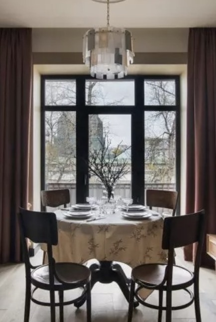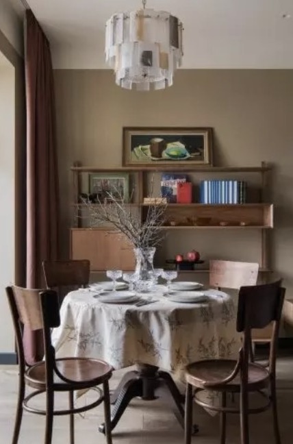 The dining table looks gorgeous too. The vase in it seems to have been created for this room exactly. To say that the girl chose simply perfect elements for the interior and design is nothing to say.