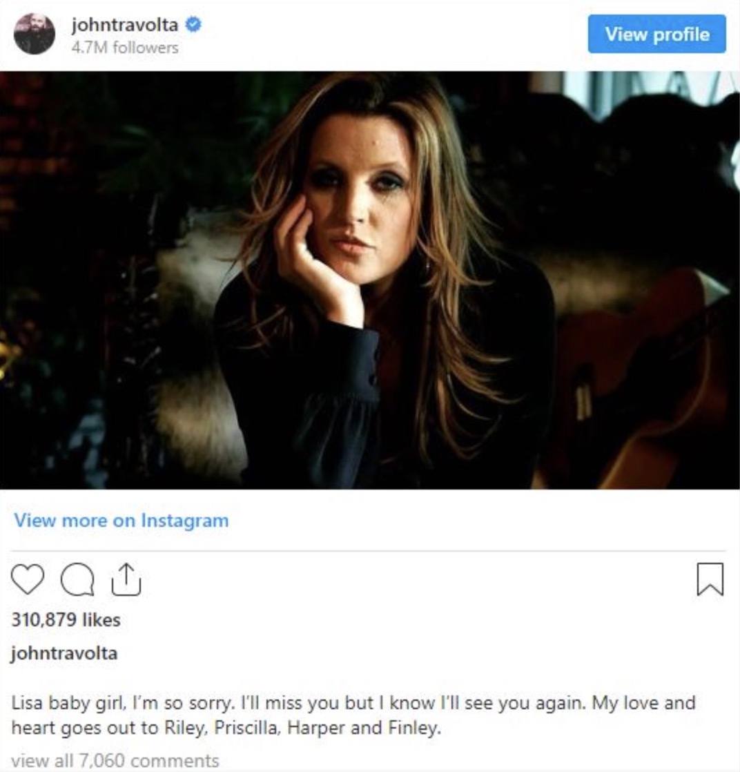 John Travolta added to the sadness by tweeting a photo of his daughter, Elvis Presley’s only child, along with a poignant letter. In his post, he extended his sympathies to Riley, Priscilla, Harper, and Finley and his wish to meet paths again someday.