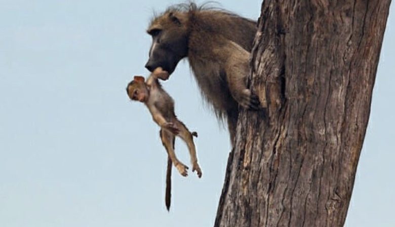 As this was taking place the baboon’s father was able to come down out of his tree, grab the baby and climb back up the tree to safety.
