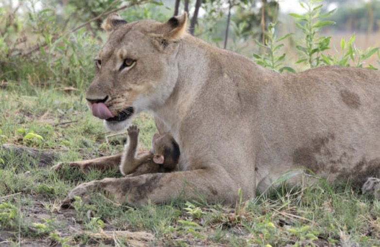 The lioness was very gentle as she picked him up in her mouth and carried him away from the tree. Before long they were cuddling.