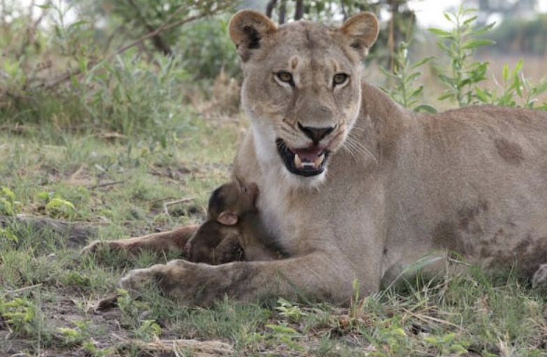 It almost seems as if the baby baboon considered the lioness to be its new mother. It also seems as if the lioness had some maternal instincts kicking in as well.