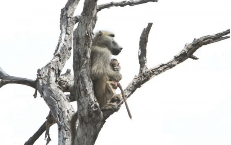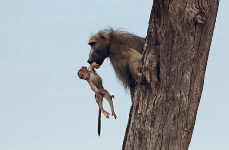 As this was taking place the baboon’s father was able to come down out of his tree, grab the baby and climb back up the tree to safety.