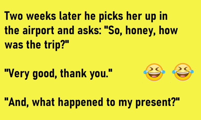 Two weeks later he picks her up in the airport and asks: “So, honey, how was the trip?”