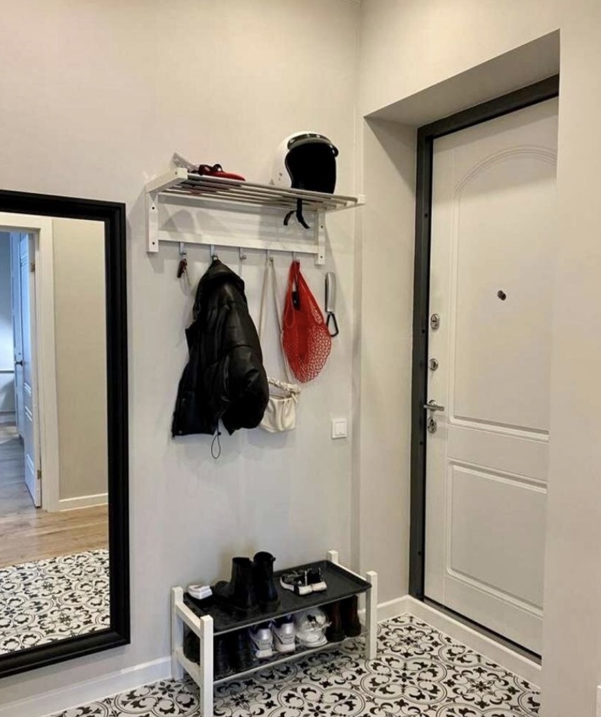 What concerns the corridor, they installed hangers and a shoe rack. Right in front of the door there is a closet in a dark green color.