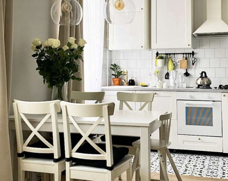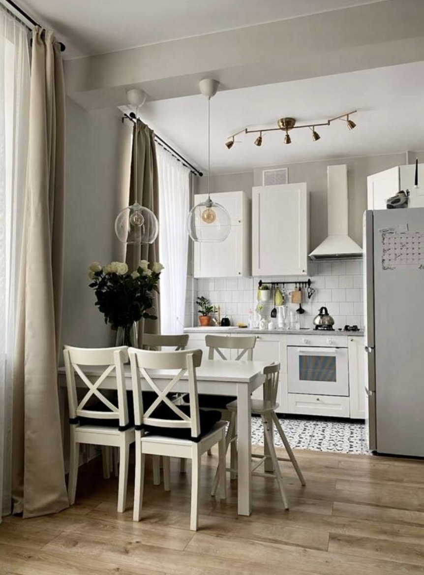 The light color of the walls, floor and green elements look harmonious and very stylish. They definitely made the right choice. In the living-room there is a dining area. The furniture here is in a mint green color and perfectly matches the décor.