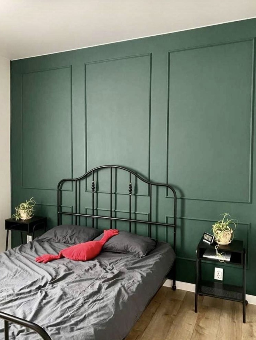 A darker green color became suitable for the bedroom. It matches with metallic black and looks truly modern and minimalistic. Here, one can see a queen-size bed and a dressing table.