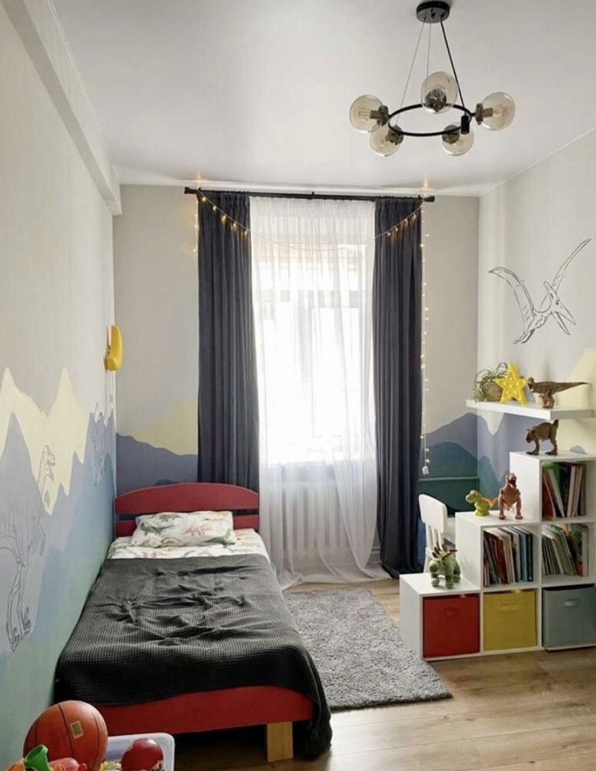 Dinosaurs became the main theme in the kids room. Beside the windows there is a comfortable bed in front of which there is a table where one can do the homework. The bathroom and the toilet are designed in a modern way as well.