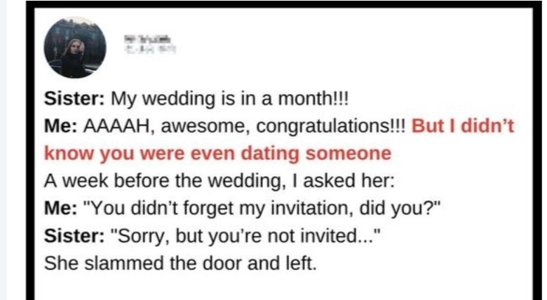 A Redditor shared from their deleted account as, “My sister was getting married soon, but she hadn’t invited me. I didn’t even know she was dating someone. A couple of days before the wedding, I asked her about it.
