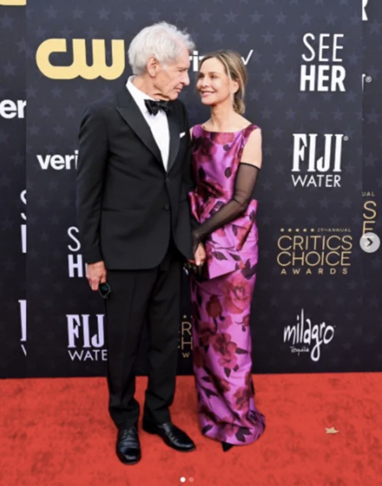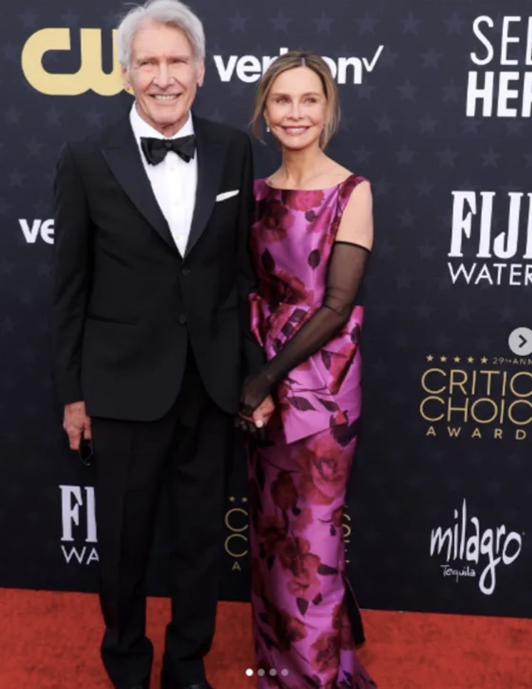 The wife of Hollywood legend Harrison Ford, Calista Flockhart, recently attended the Critics Choice Awards with her beau. Pictures of the star couple showed Flockhart adorning a floral print fuschia-colored gown with a big bow fitted by her waistline.