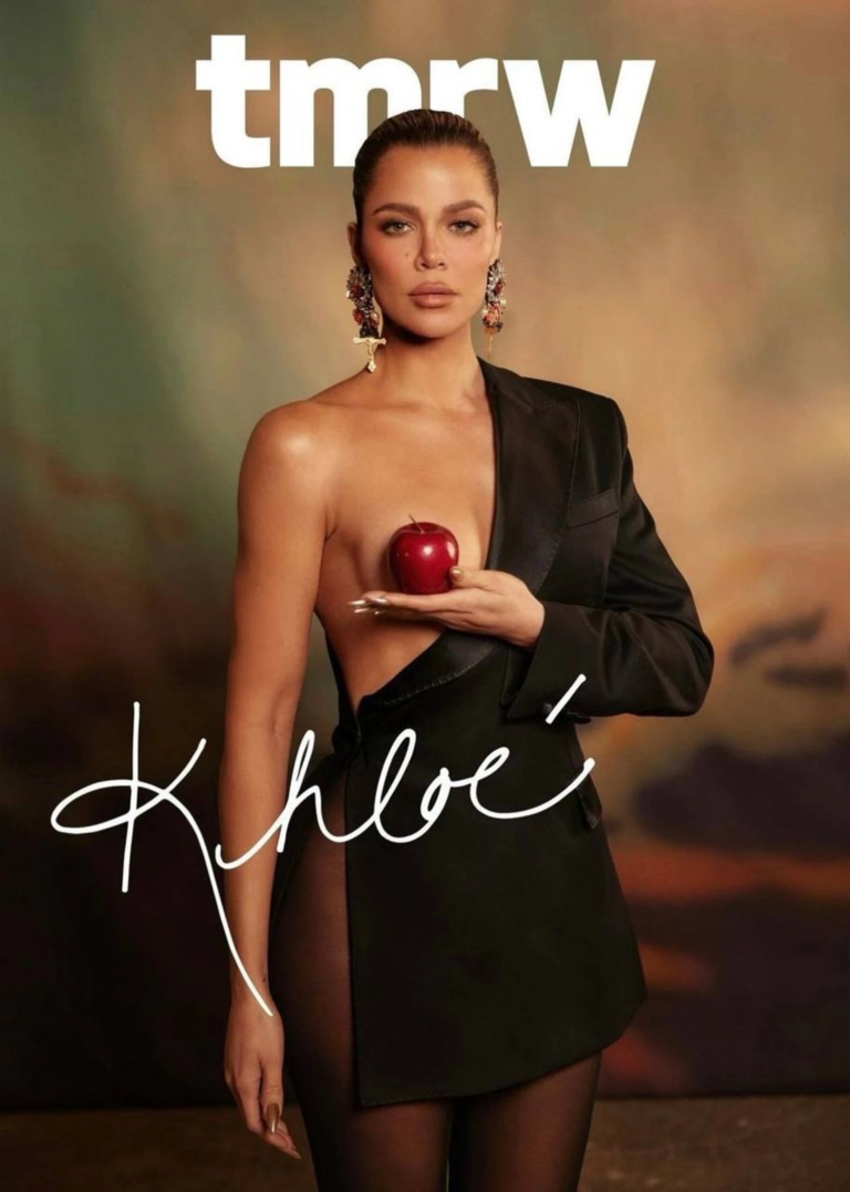 Eve, oh, Khloe Kardashian appeared in a racy look on the cover of a special issue of TMRW Magazine. She was paired with a black one-shoulder Dolce & Gabbana blazer dress and massive House of Emmanuele earrings. To cover her bare chest, the 39-year-old star picked up a red apple. Makeup artists gave her makeup in nude tones, and stylists styled her hair in a sleek bun.