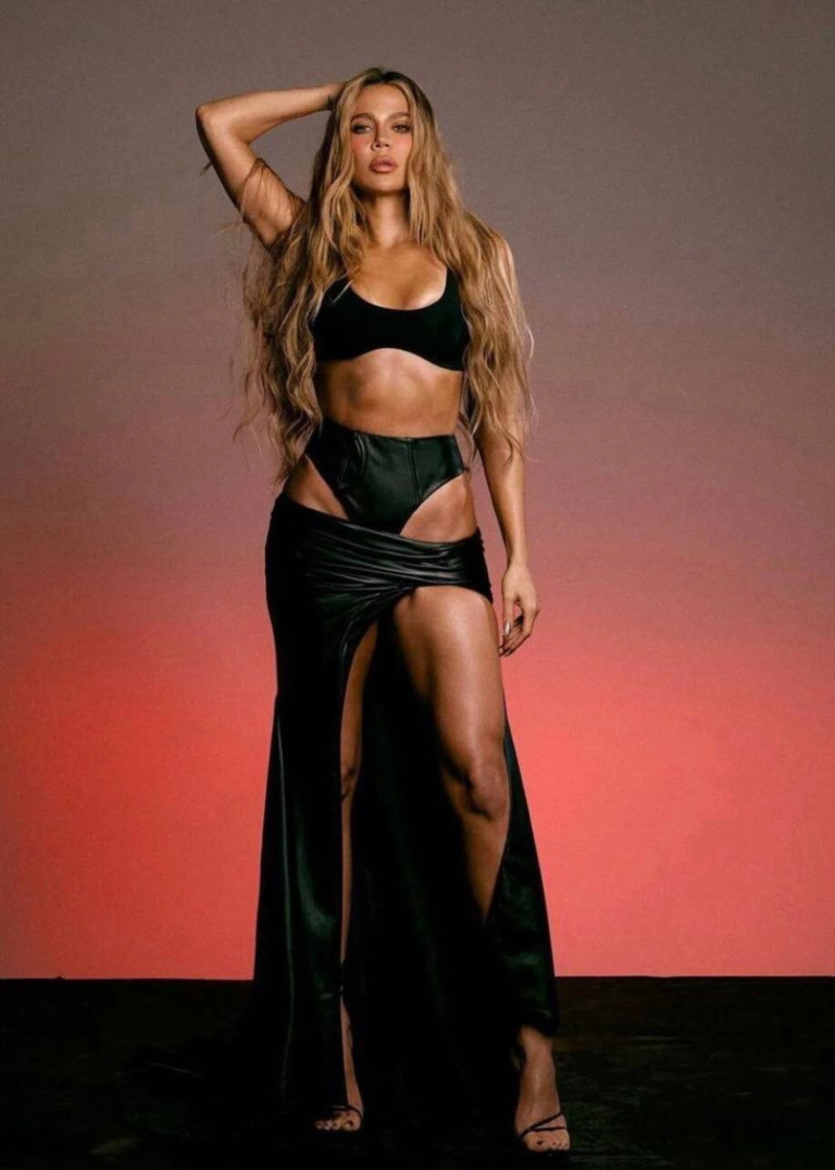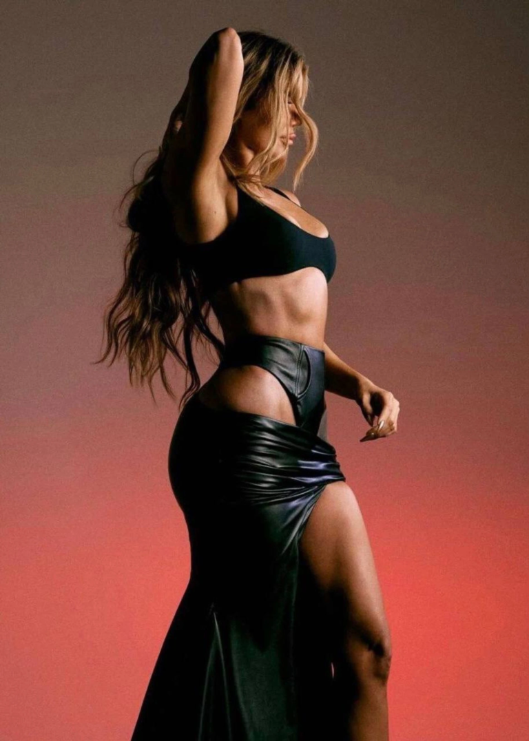 In the remaining photos, the socialite let her hair down and wore a black top and a leather skirt with a revealing neckline.