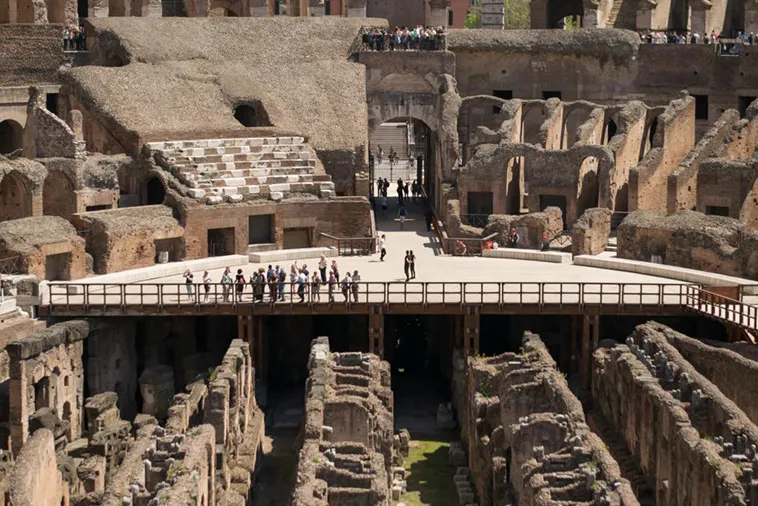 Consisting of a large central passage along the major axis and twelve curvilinear corridors, in the hypogea of the Colosseum there were the freight elevators that allowed the machinery or animals used in the games to get on the arena and which were probably housed in a series of environments service along the perimeter wall. To raise the scenic materials to the surface from the undergrounds, articulated systems with counterweights and inclined planes were used, of which the holes in the paving of the corridors are still visible today.