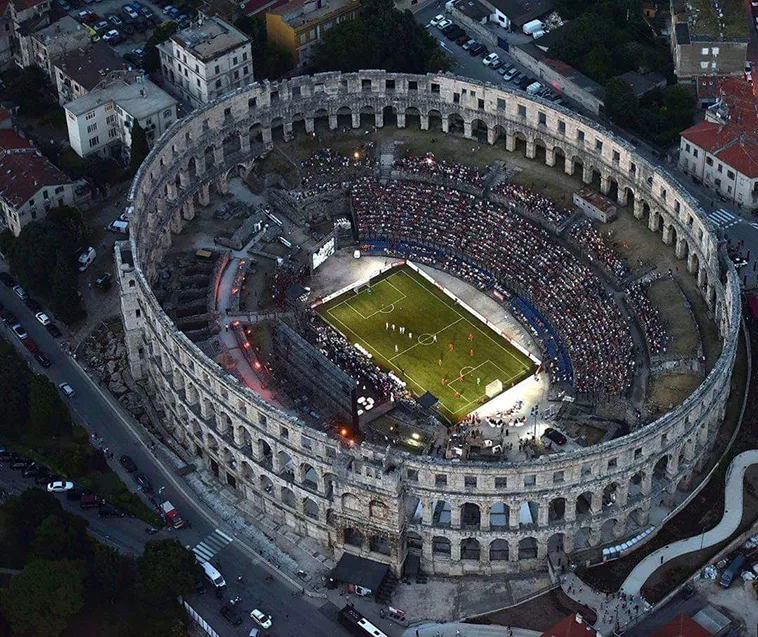 A football match was played in the ancient Roman Amphitheater, in Pula, Croatia. There used to be gladiator fights, and today it’s football.