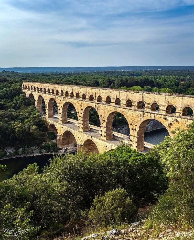 The Pont du Gard is an ancient Roman aqueduct bridge built in the first century AD to carry water over 50 km to the Roman colony of Nemausus. It crosses the river Gardon near the town of Vers-Pont-du-Gard in southern France.